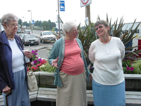Irene, Ruth, and Janet wait outside the Fish Bar.