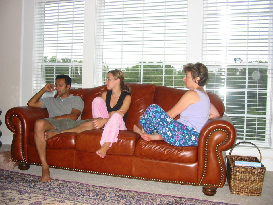 Raj, Julie and Rebecca relax on the couch.