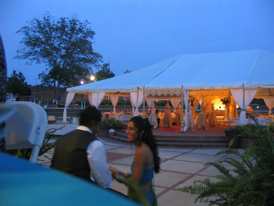A beautiful day in Georgia for a beautiful wedding. Raj and Julie chose a two-part wedding. First, the elaborate and colorful Hindu ceremony. Then, later, the Christian ceremony. An intermission between ceremonies provided an opportunity for the Bride and Groom to change their garmets. Photographers used the time to take pictures. The guests enjoyed snacks in the welcome air conditioned Festival Center. After the Christian ritual the guests once again retired for refreshments while the crew prepared the tent for the Reception under the Main Tent.